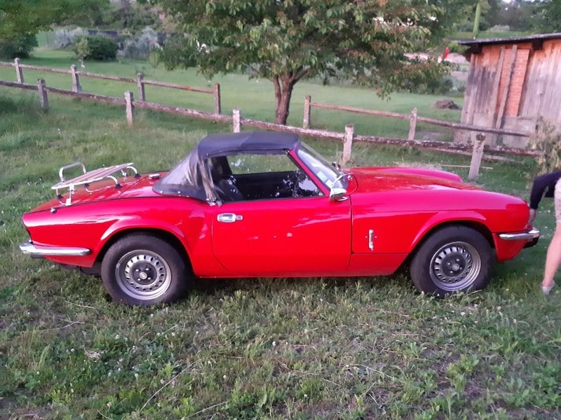 1) TRIUMPH MK IV. Year 1972. Normal 7 HP registration, 1300 cc petrol engine. Engine rebuilt to new 3500 KM approximately, new clutch, new overdrive, new water pump, new brake and clutch master cylinders, carburettors overhauled to new, Convertible with Hart Top, Bordeau red colour, MWS Chrome spokes wheels, good tyres, average interior.