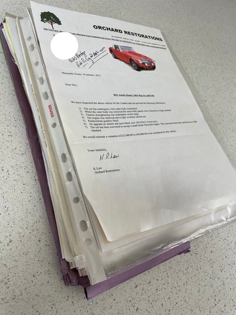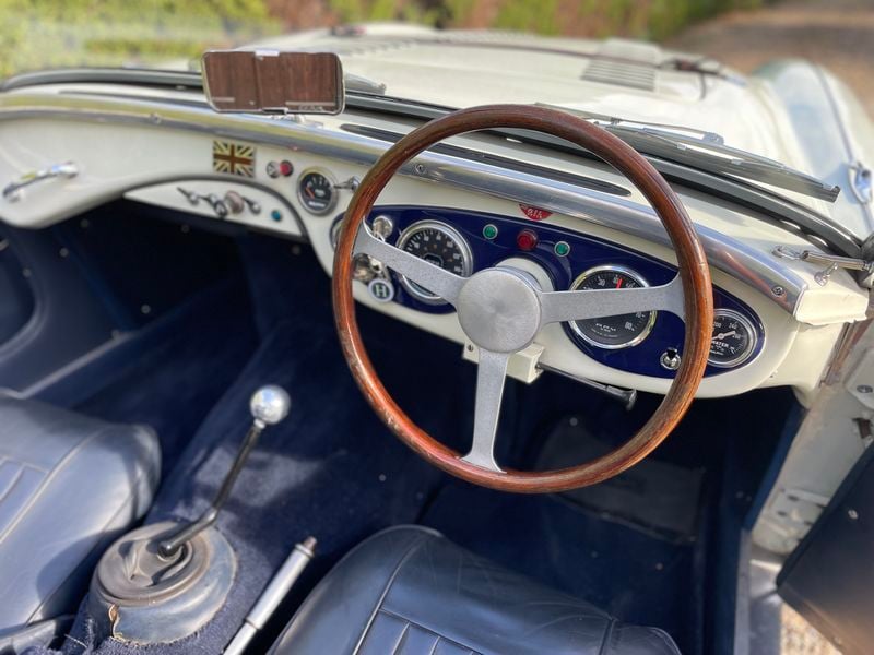 Chegou ao Reino Unido em 1994 e teve apenas quatro proprietários desde então, sendo o atual desde 2019. O ficheiro de história mostra que foi extensivamente restaurado por especialidades Healey, Orchard Restorations, em 2012, ficando com um acabamento em Old English White sobre azul. O pormenor exterior é impressionante, nomeadamente o aspeto deliberadamente sem para-choques, o escape de saída lateral e as bonitas jantes D-type com os seus tri-orelhos cromados.