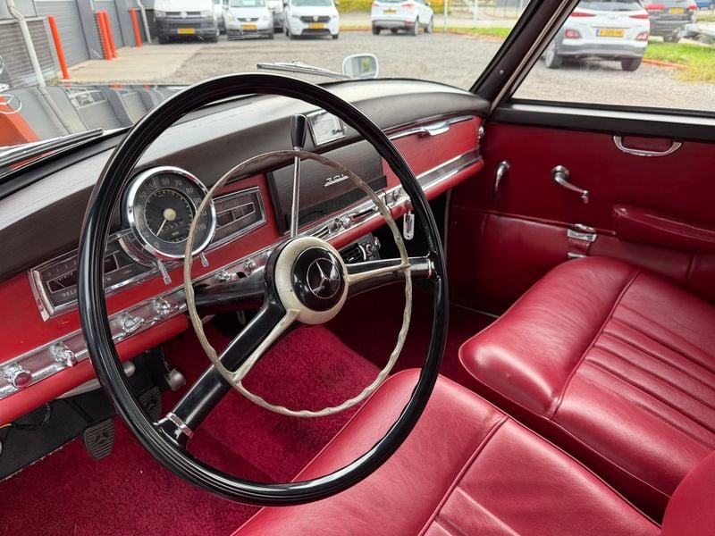 Der Wagen wurde vom Vorbesitzer umfassend restauriert und in dem beliebten Schwarz neu lackiert, passend dazu ein burgunderrotes Leder-Innenraum. Der Zustand ist beeindruckend. Das Schwarz betont die umfangreiche Chromführung des Fahrzeugs und das Interieur verrät eine leichte, charaktervolle Patina. Der Wagen ist mit moderner Klimaanlage ausgestattet. Auf den Fotos sind einige kleinere Punkte zu beachten, aber nichts Ungewöhnliches.