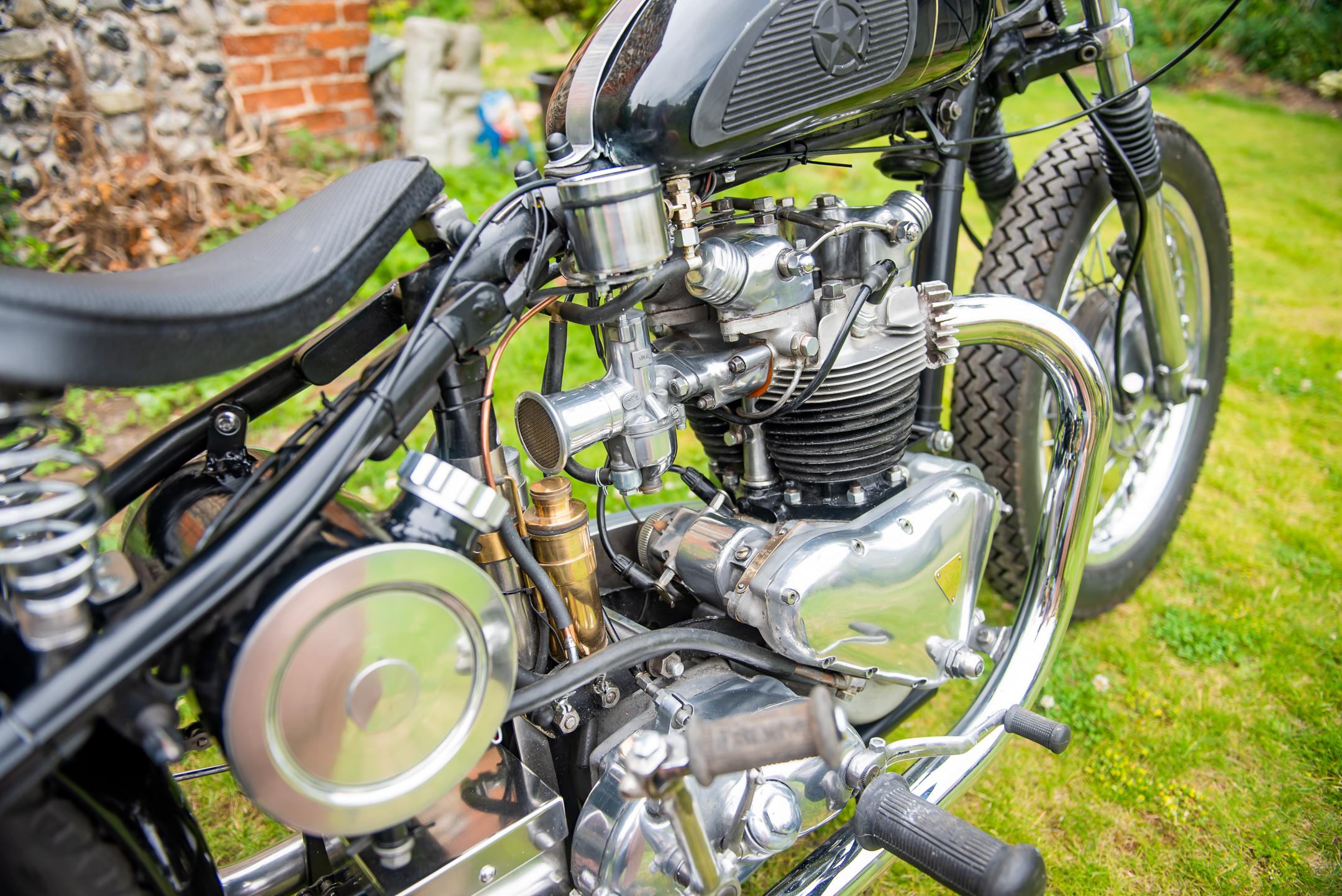 - Le moteur est alimenté par un nouveau carburateur concentrique Amal en alliage et les tuyaux coupés que la moto avait à l'origine ont été dotés d'embouts latéraux.