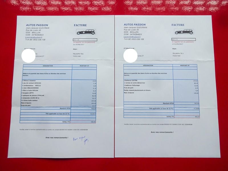 Das Auto hat den belgischen Historic Vehicle Status und ist von der periodischen Inspektion befreit; seine Laufleistung ist im belgischen Car-Pass-System dokumentiert. Begleitet von Heritage Certificate, Zulassungsdokumenten und einer ausführlichen Akte mit Restaurierungs- und Servicerechnungen ist dies ein gut dokumentierter TR3, bereit für seinen nächsten Besitzer.TR3 (11).jpg1.82 MB
