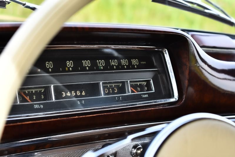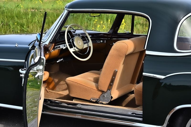 This 1960 car left the factory laden with DM 2,230 worth of optional extras — a substantial sum at the time — headlined by the rare Webasto sliding steel sunroof and a Becker Mexico/Europa radio. The special-order DB 291H Dark Green paint gives the car a distinguished presence. Inside, the specification extends to a Coco/Velour carpet upgrade, luggage compartment trim package, and reclining front seats, all complementing the walnut wood dashboard and leather trim. Having undergone a restoration, the vendor describes this 220SE Coupe as presenting very well throughout. It sits on whitewall tyres with front auxiliary fog lamps, a full chrome exterior trim package, and ivory steering wheel — a handsome and period-correct specification.220SE Ponton Coupe (8).jpg2.95 MB