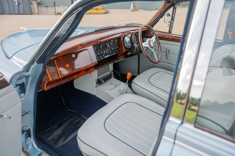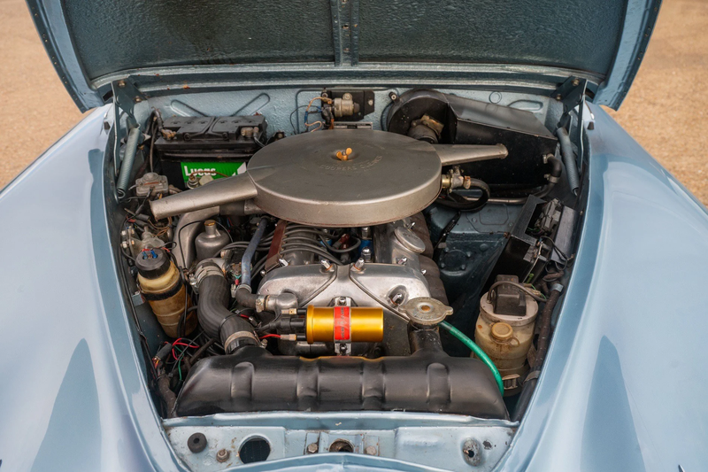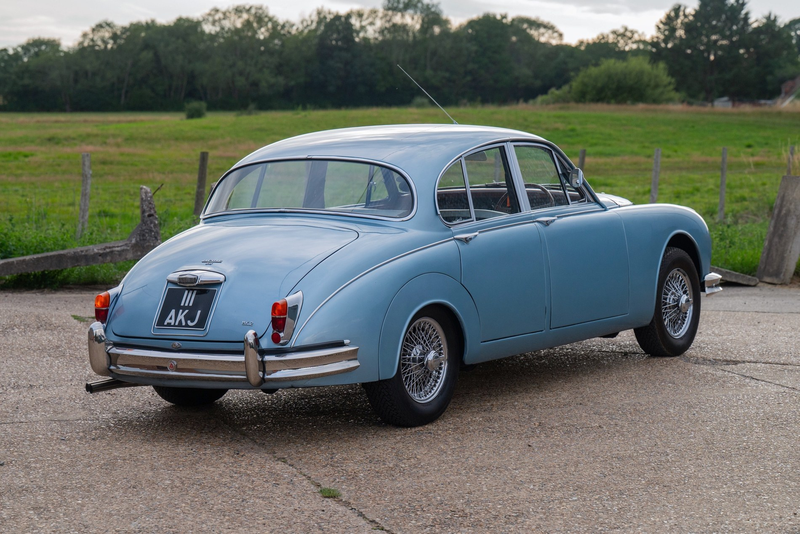 Dieses Exemplar glänzt auch in der auffälligen Metallic-Lackierung Opalescent Silver Blue des E-Type - eine Option für den Mk2 der damaligen Zeit - und ist eines der schönsten Exemplare, die wir gesehen haben. Außerdem präsentiert er sich nach einer umfassenden Restaurierung durch den MK II-Guru David Sedge auf einem sehr hohen Niveau. Die Arbeiten umfassten Karosseriearbeiten und Neulackierung, eine neue Innenausstattung in Hellblau, neue Holzfurniere und eine komplette Überholung des Motors.