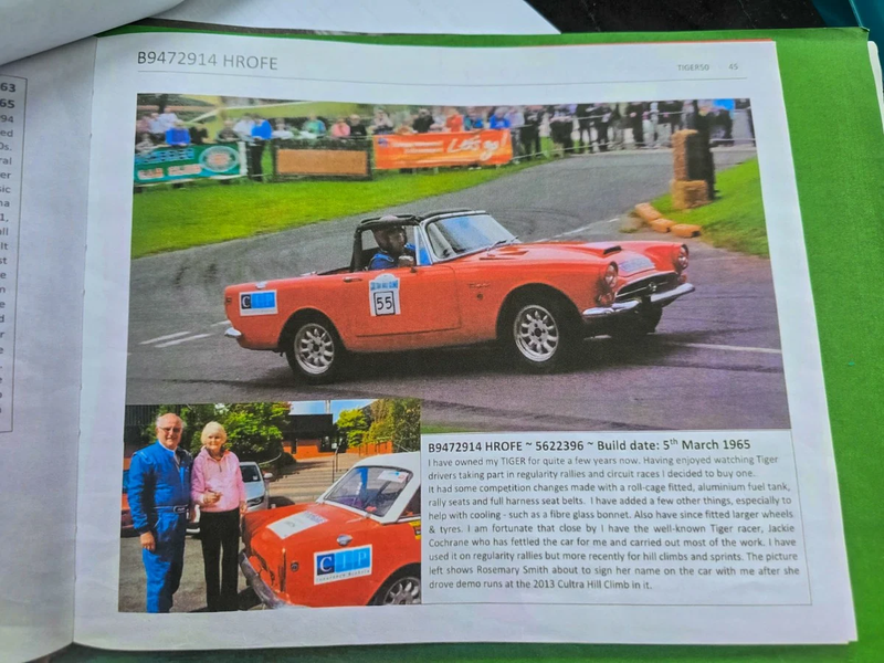 • Rosemary Smith - Works Tiger driver in the 1966 Monte Carlo Rallye - completed demonstration runs in the car at the 2013 Cultra Hill Climb