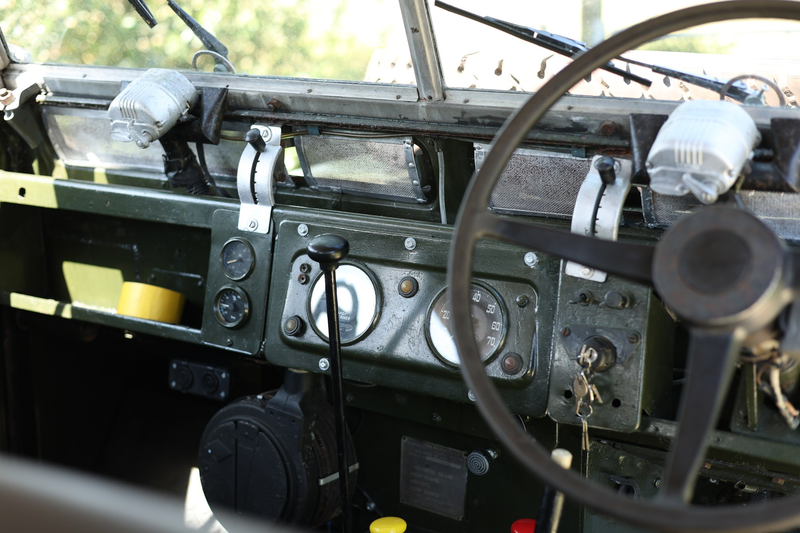 Comme l'attestent les photos, cette Landy est en très bon état pour un véhicule de cet âge et de cette nature, avec une carrosserie en alliage "Birmabright" remarquablement droite, des garnitures galvanisées propres, des roues très présentables, et un toit extrêmement bien entretenu. L'intérieur semble également bien entretenu, avec des signes d'usure minimes sur le vinyle noir de base. Sous le capot se trouve le vénérable moteur à essence Land Rover de 2,25 litres, et les amateurs aux yeux d'aigle auront déjà remarqué les moyeux avant à roue libre, qui font vraiment la Marque quand on plonge sur la route.