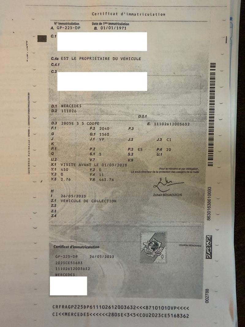 This left-hand drive, low grille coupé has been comprehensively restored and, according to the vendor, presents in very good order both inside and out. Adding to its appeal is the original 1971 book pack, which includes the data card, owner's manuals, and Mercedes-Benz wallet. The car's recent provenance traces from Italy to Bordeaux, then onward to Ireland, and most recently to London, each leg completed under its own power. The vendor reports that during his own drive through dense London traffic, the temperature gauge held steady, the idle was smooth, and the automatic gearbox shifted cleanly.
