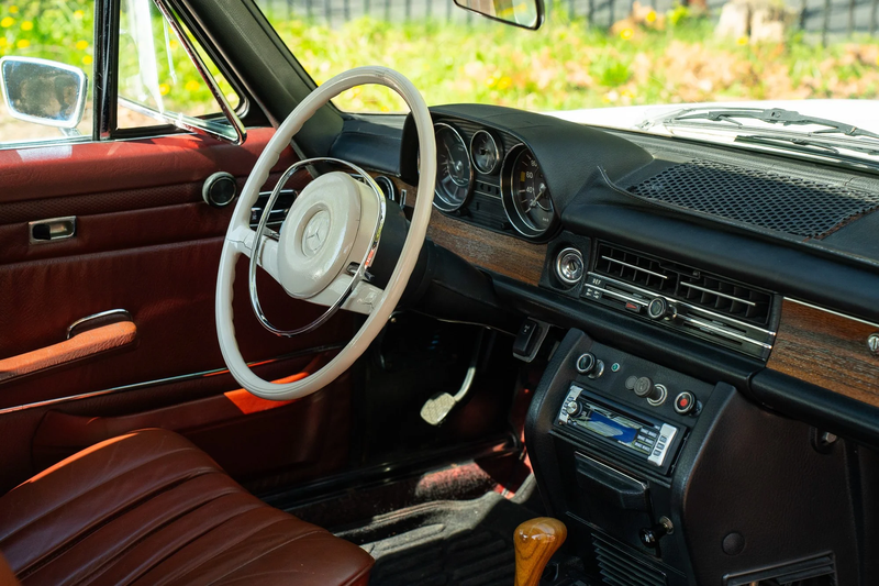 Classically finished in the attractive combination of white over burgundy leather, this is a tidy and presentable W114 that retains many of its original factory features. There is scope to improve it, but with that MOT in place it is ready to use.