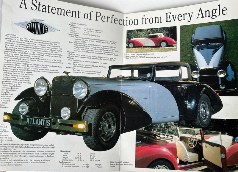 "Un'auto di tale bellezza, esclusività e significato storico è raramente disponibile sul mercato. Il restauratore capo della Royal Mews Collection della defunta Regina Elisabetta II una volta ha descritto l'Atlantis come "semplicemente stupefacente: le proporzioni e le linee sono perfette e ineguagliabili".