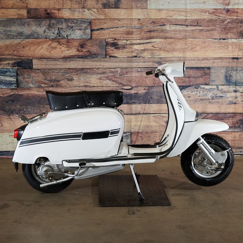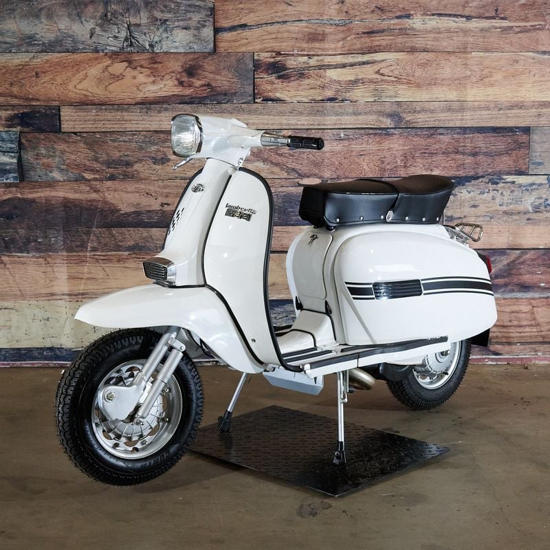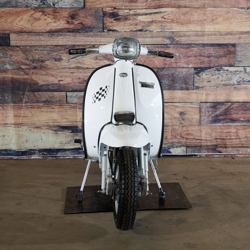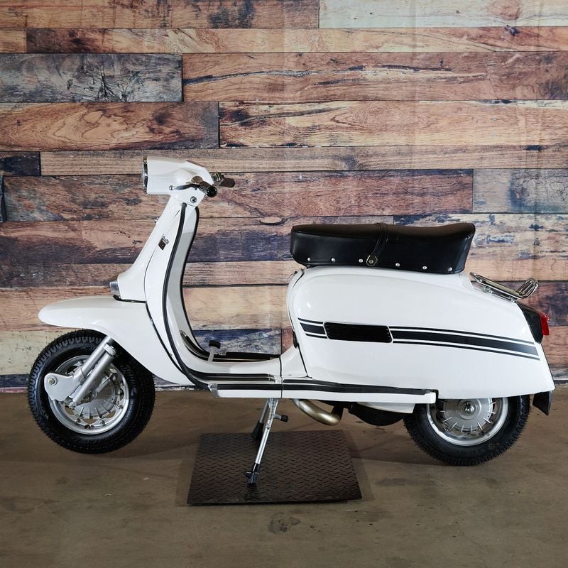 Cette Lambretta GP entièrement restaurée est peinte dans une teinte blanche d'usine qui, selon le vendeur, scintille sous n'importe quelle lumière. Décrite par le vendeur comme ayant été « minutieusement reconstruite avec des détails d'époque et des améliorations de fiabilité modernes », elle serait fidèle à l'esprit de l'original tout en offrant une conduite plus fluide et plus sûre.