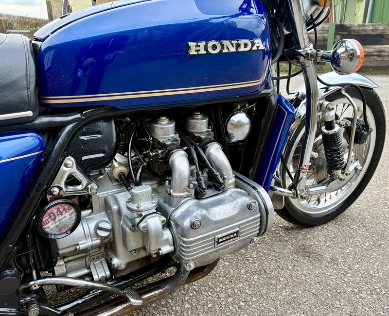 Il n'est pas surprenant que les bons exemplaires de l'originale Goldwing soient très recherchés par les collectionneurs. Cette moto est arrivée des États‑Unis en 1993 et fait partie d'une collection privée depuis 2009. Terminé en bleu électrique avec des tracés dorés, c'est un bel exemple avec un chrome brillant. Puis il y a le side-car Watsonian assorti, qui apporte du caractère et une praticité supplémentaire.