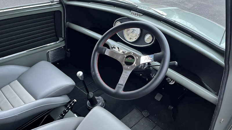 This is a Mini Van, but not as we know it. The hints are there - Cooper Tweed Grey paintwork with old English White roof. 60th Anniversary Minilites. Dunlop SP Sport tyres. This is a clever restomod that blends standard-looking aesthetics with thoroughly overhauled and ‘Cooperised’ running gear.