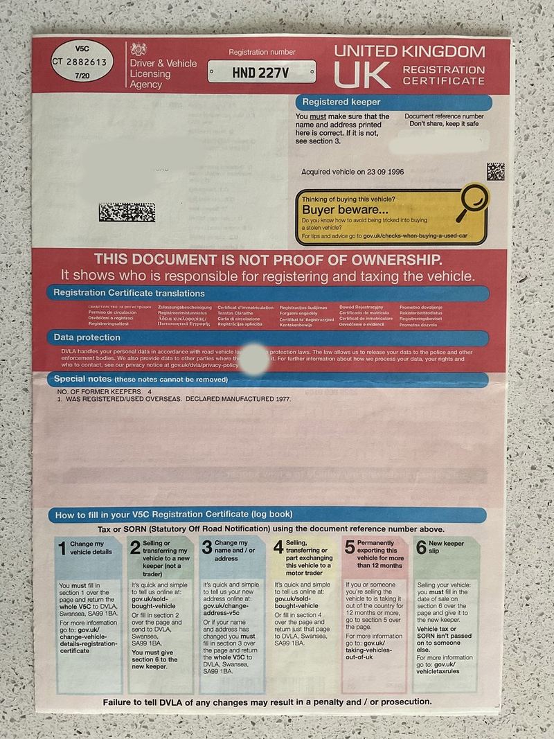 - L'immatricolazione "V" riflette l'immatricolazione nel Regno Unito del 1979 e non la data di produzione del 1977.