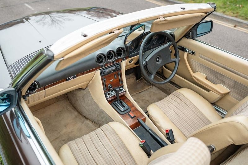 El coche es de color raro Marrón manganeso con interior de tela beige y vinilo. Nos dicen que fue restaurado ampliamente a mediados de los años 90 tanto en lo mecánico como en la carrocería. Actividades más recientes incluyen un radiador nuevo de Mercedes y frenos de disco de repuesto. Se dice que el coche es muy fiable, pero quizá no esperarías menos de un descapotable de Mercedes con motor M116 y sobreingeniería.