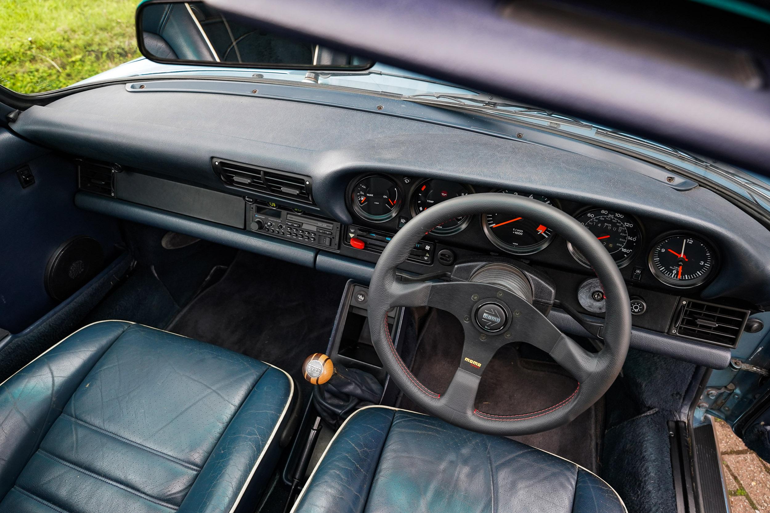 In addition to the above, the current owner states that new sports dampers have been fitted in the front and rear, as well as a full alignment performed by a suspension specialist in 2022. The current owner has also fitted new front brake pads and discs recently, and reports they stop excellently. The Porsche is further enhanced with a new Momo leather steering wheel and a classic wooden shift knob featuring a 911 logo. Originally Iris blue from Porsche through the paint to sample scheme, it has remained partially original, but has had a respray in the past, performed to a high standard.