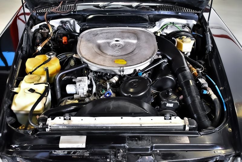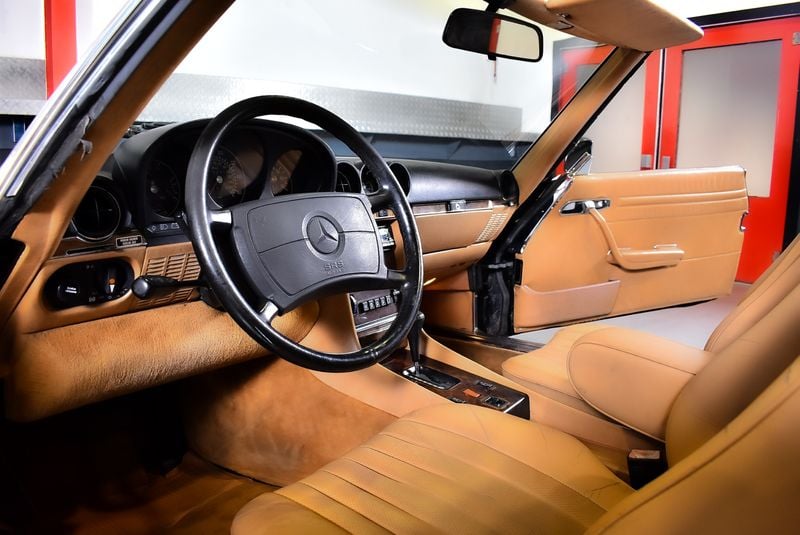 This 1987 example presents in the combination of black paintwork over Palomino leather, complemented by a black fabric soft top. It retains its matching-numbers V8 engine and benefits from a well-documented past, supported by a clean CARFAX report that confirms its damage-free record and original mileage of 126,299 miles. Adding to the provenance is the car's window sticker and Mercedes-Benz datacard, the latter detailing its generous specification including automatic climate control, heated and electrically adjustable exterior mirrors, an anti-theft warning system, heat-insulating glass all around, illuminated vanity mirrors, and an automatic antenna.