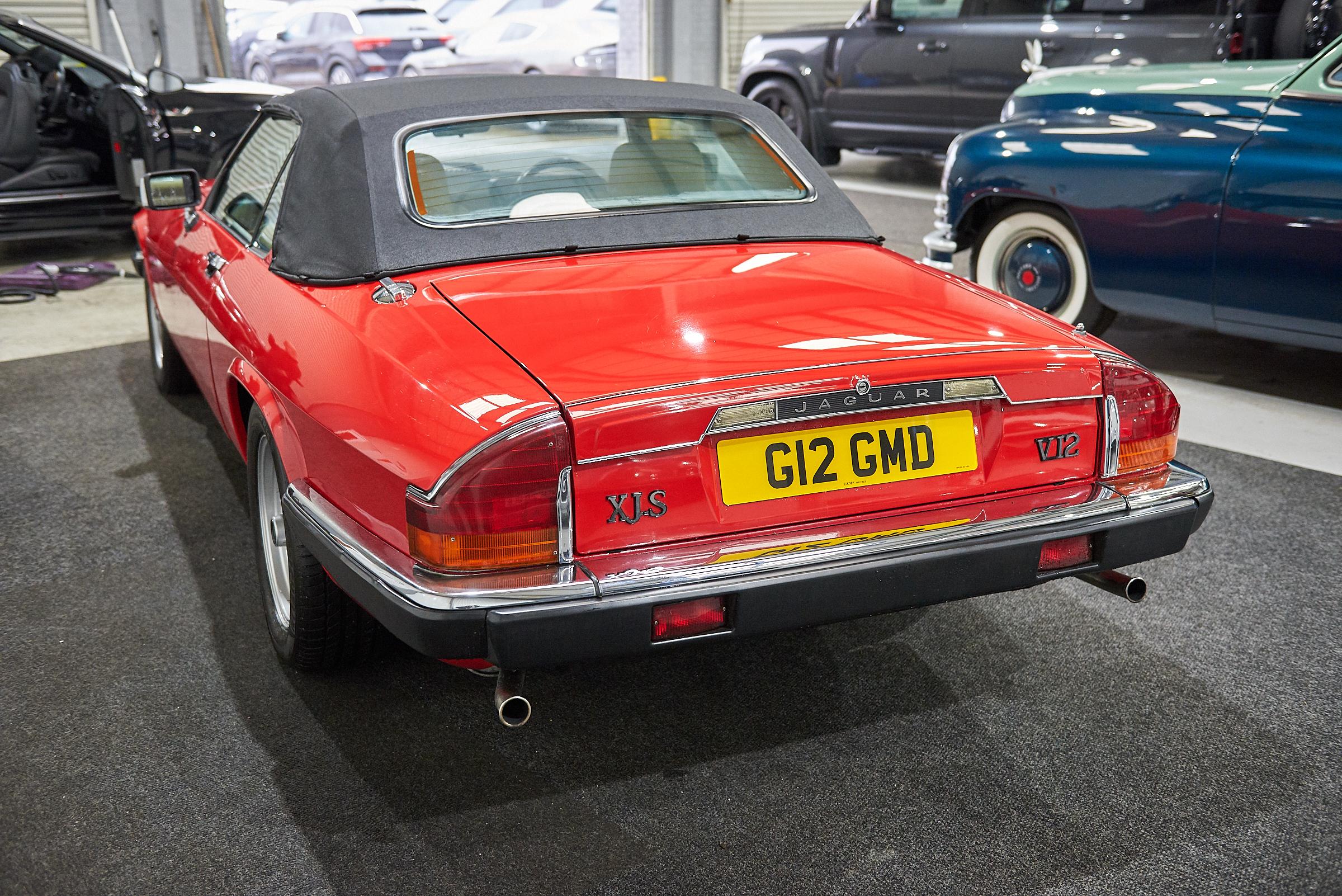 La peinture rouge signal de cette XJ-S lui permet de se démarquer. Elle n'a pas de défauts ou d'éclats visibles et a manifestement été très bien entretenue. En descendant le long du véhicule, les garnitures chromées ont reçu le même traitement et restent brillantes comme des miroirs, sans aucune trace de corrosion.
