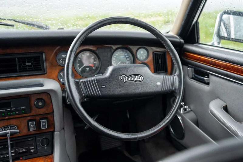 Soltanto 1.159 Daimler Double Six furono costruiti. Queste auto offrivano pelle e rifiniture in legno di qualità ancora migliore, oltre a una serie di extra tra cui cromature ancora più abbondanti. Quest’auto del 1991 è una delle ultime prodotte, rifinita con maestosità in blu scuro metallizzato, abitacolo in noce e pelle color grigio piccione.