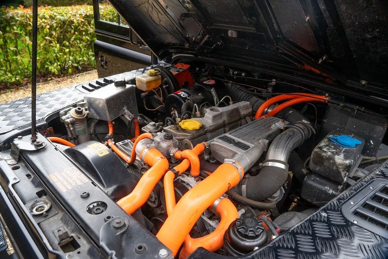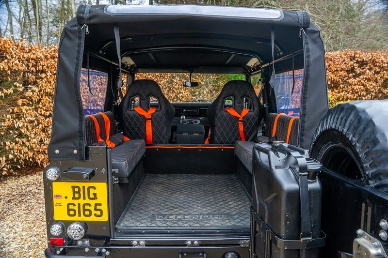 Este exemplar de julho de 1991 leva esse plano de fundo ao máximo. Reimaginada em Santorini Black com interior dramático Preto & Laranja, passou por uma reconstrução e transformação abrangentes, coroada por uma upgrade muscular do motor 2,8 litros TGV. O vendedor descreve-a como um “Defender 90 com especificação SVO único,” acrescentando que já percorreu “apenas 6000 milhas desde uma reconstrução completa da carroçaria, chassis e motor em 2010” e tem sido “cuidadosamente cuidada e mantida desde então.” Um fichário A4 cheio de faturas e fotos de construção disponível, incluindo uma reportagem de julho de 2010 na Land Rover Monthly, lê-se como um diário da evolução, sublinhando que não se trata de uma construção pronta para venda, mas de uma visão cuidadosamente executada.