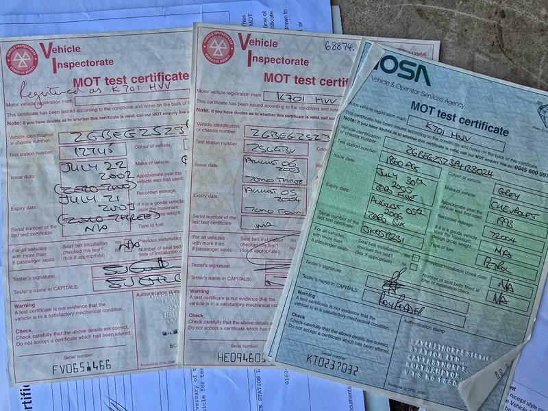 • Various historic MOTs and test slips included in paperwork