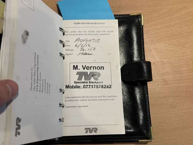 The history file includes a stamped service book and specialist invoices charting the car's maintenance from its first service at 947 miles right through to 2025. The file also includes the original factory order sheet and correspondence from TVR. Mechanically, the car benefits from Nitron suspension, an AP Racing clutch, and braided steel brake hoses.