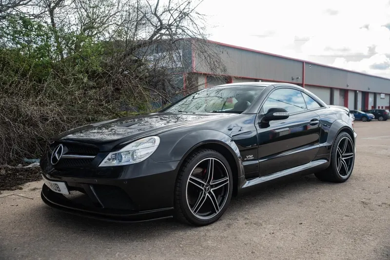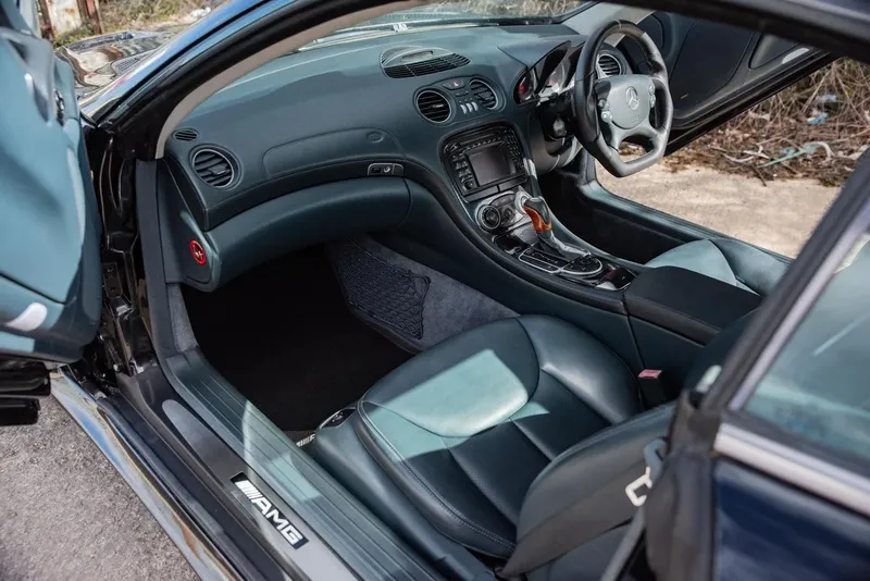 Dieser 2003er SL500 wurde im Jahr 2023 vom aktuellen Besitzer erworben und scheint kurz darauf in die hier gezeigte Form umgebaut worden zu sein. Die Arbeiten umfassten das Anbringen eines Breitbau-Kits mit großen Front- und Heckstoßfängern sowie die Farbänderung von Silber zu Metallic-Schwarz. Das passt zum bedrohlichen Erscheinungsbild des Fahrzeugs, ebenso wie die 19-Zoll-Fünf-Speichen-AMG-Felgen. Innen behält die Kabine das dunkelblaue Leder, wird aber mit karbon-ähnlichen Akzenten veredelt.