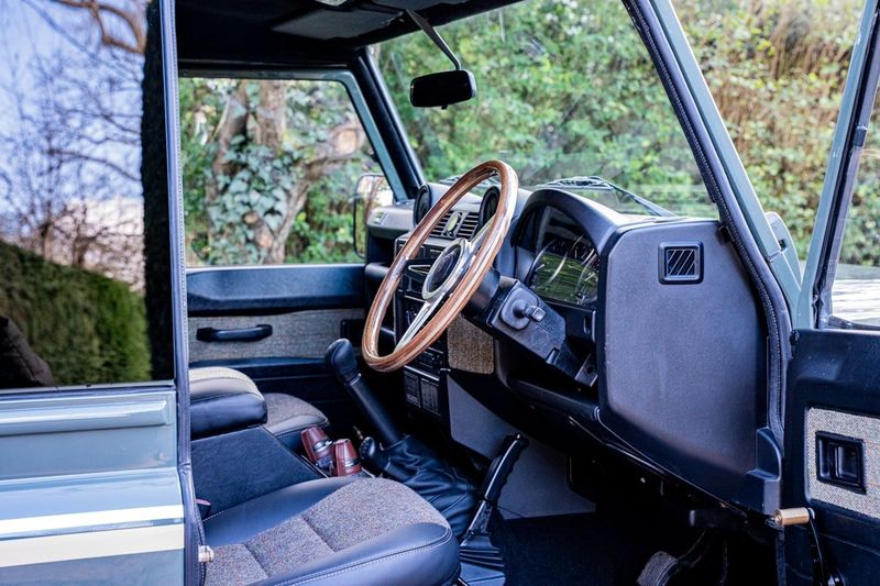 Per praticità, il tappeto posteriore si solleva per rivelare una superficie in finta quercia facile da pulire per scarpe fangose, mentre i posti a sedere a due panche posteriori rivolgono all’indietro includono cinture e maniglie. È incluso un slot per la fotocamera a scatto e un contenitore per proiettili, come parte della configurazione. Questo esemplare ha percorso circa 65.400 miglia tra le mani di un solo precedente proprietario registrato. Con la targa Centurion che ne conferma il numero 2 di 2, questa è una rara opportunità di acquisire un Defender su misura con carattere e provenienza interessante.
