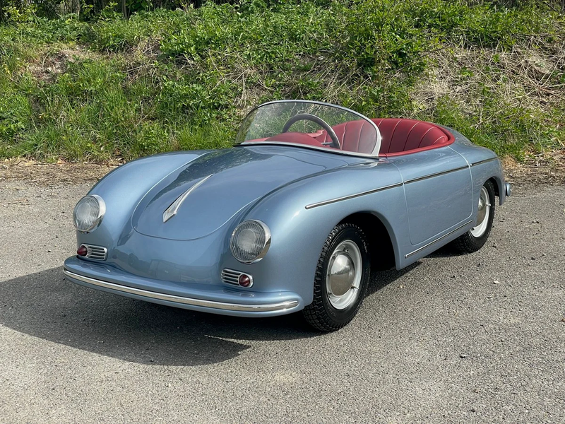 Notre exemplaire, fabriqué vers 2009, a bénéficié d’une restauration comprenant une repasse complète en Metallic Eisblau (Ice Blue), un processus à lui seul coûtant plus de 1 000 £. Le résultat, associé au cuir rouge, offre une harmonie de couleurs élégante qui peut être observée dans les photographies ci-jointes. Sous la carrosserie en fibre de verre se trouve un moteur essence de 110 cm3 couplé à une boîte semi-automatique à trois vitesses avec marche arrière, tandis que les freins à disque Brembo assurent l’arrêt. La voiture est signalée comme entièrement fonctionnelle, avec phares, clignotants et klaxon tous opérationnels. Un limiteur de vitesse peut également être monté pour les jeunes conducteurs.