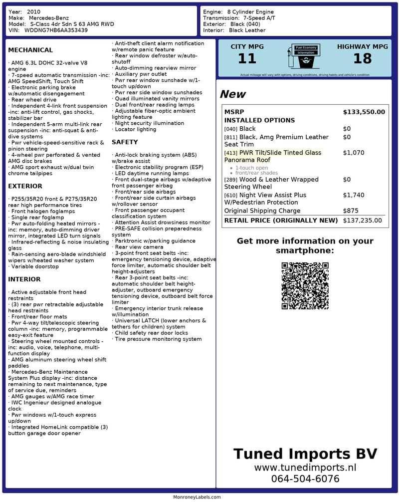 Original window sticker showing MSRP of $137,235