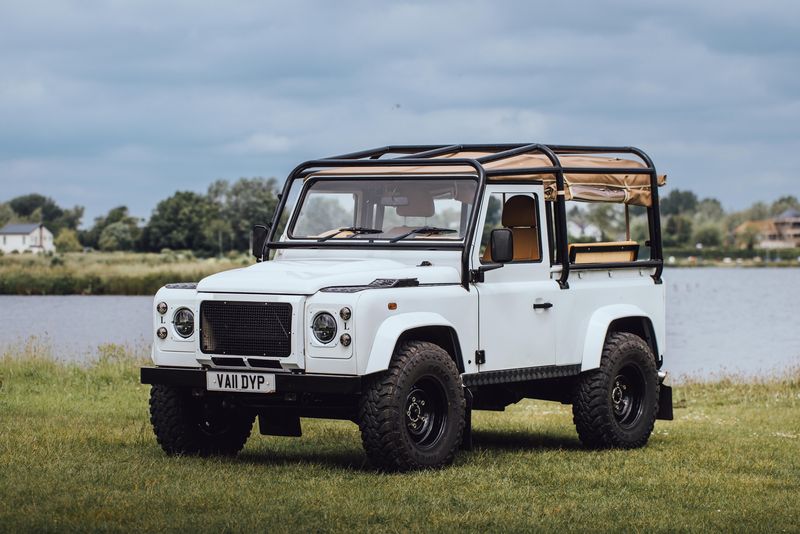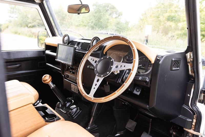 The original Fuji White exterior provides a clean canvas for the striking black heavy-duty hoop set and external roll cage, while the interior has been elevated with bespoke biscuit tan upholstery and handcrafted wooden elements. With just 49,549 miles on the odometer, this Defender presents superbly for its age and is complete with an advisory-free MOT.