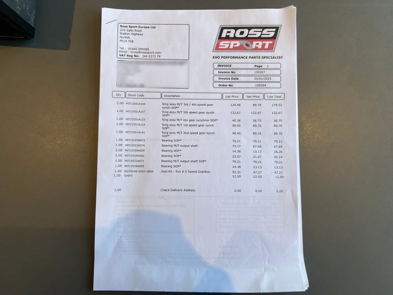 - Ross Sport invoice dated January 2025 for gearbox components, including synchro rings, bearings, seal kit, clutch release fork, front anti-roll bar drop links and gearbox oil, totalling £1,188.58