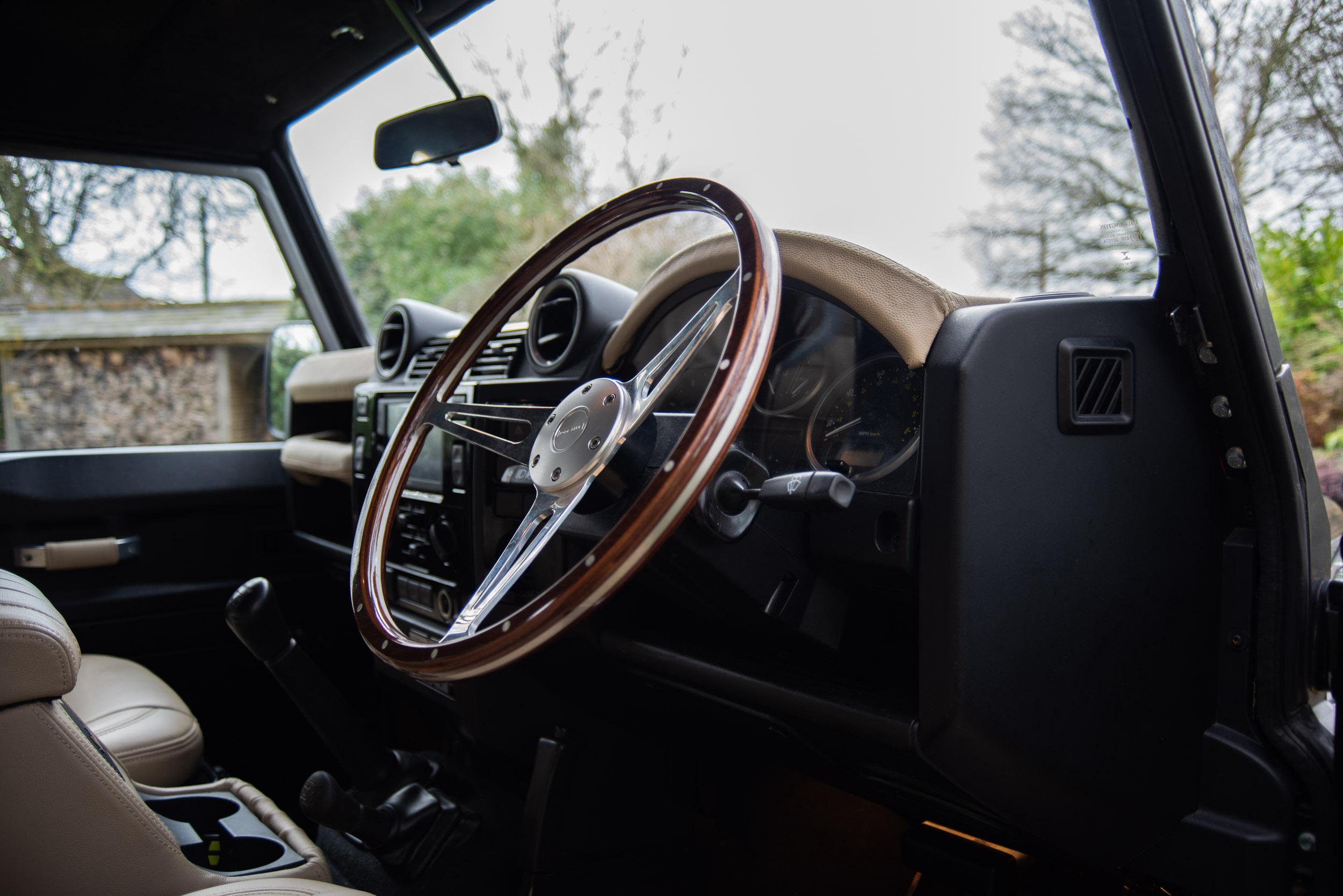 Looking at the switchgear and trim, it’s mostly Land Rover standard fitment, which means it’s robust and hearty in operation. It wears some light patina in places and the odd minor mark, but overall looks very good. Where changes have been made are to the infotainment – with a modern Sony double DIN unit installed – and the steering wheel. We love that thin, wood-rimmed wheel, and it really adds a splash of class to the Defender’s cabin.