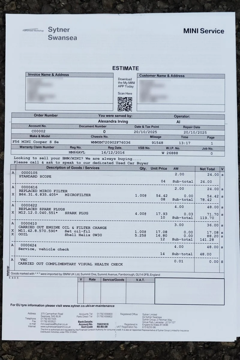 Full major service completed by Swansea Sytner Mini at 91,000 miles