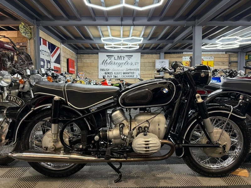 BMW debuted their new line of / 2 bikes at the Brussels Motor Show in 1955, The R50 alongside their new R60 and R69. The R60 displaced 600cc and made 28 bhp. All three bikes featured a new frame with leading-link Earles front forks in place of telescopic forks, and a rear swing arm suspension with dual adjustable hydraulic shock absorbers rather than “plunger” rear shocks. The hard-tail rear end was retained so that use with a sidecar was still possible.
