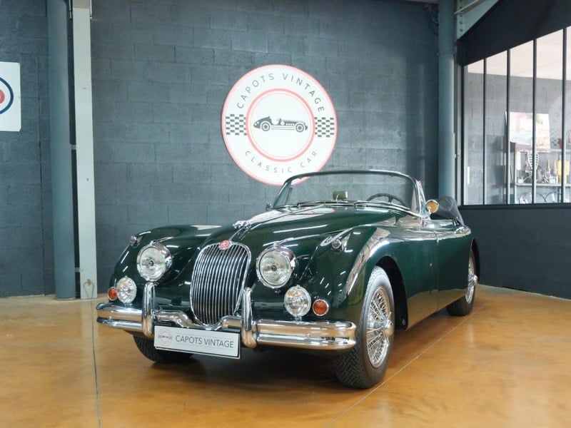 Aus England importiert im Jahr 2003 hat dieser XK 150 eine lange und sorgfältige Restauration durchlaufen, die 2019 abgeschlossen wurde. Der Motor und das Getriebe tragen die gleichen Nummern (Matching Numbers), der Lack des Karosserie wurde in British Racing Green lackiert, was den klassischen Kontrast zum Innenraum in Leder und beigefarbenem Teppich bildet. Aus einer privaten Sammlung stammend, wird er mit Rechnungen und Prüfscheinen geliefert und ist zum Genießen bereit.
