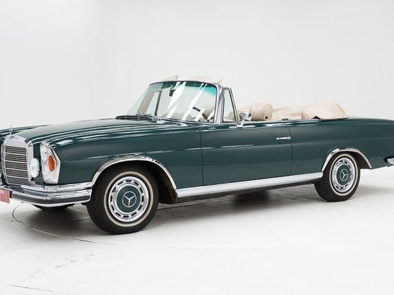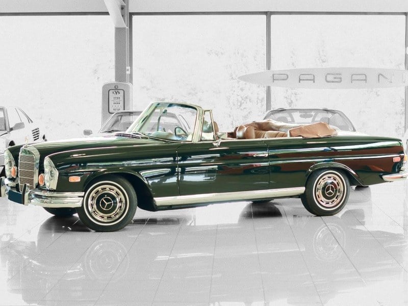 Der Innenraumzustand entspricht völlig dem sehr niedrigen Kilometerstand und der begrenzten Nutzung des Fahrzeugs. Armaturenbrett und Holzverkleidung weisen keine Beschädigungen auf, die Sitze und der markante olive-grüne Teppich befinden sich in hervorragendem Zustand. Das Fahrzeug behält außerdem seine originalen Mercede-Benz-Lamettiebs-Matten.