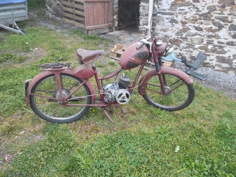 FFVE certificate for Monet Goyon issued. Compression OK, ignition to be checked, new tyres (rear inner tube to be fitted), new wiring, fuel tank to check (no corrosion), original patina. New spark plug, the chain is missing its master link. Maintenance documentation, exploded-view diagram and technical documentation supplied. To be collected on site.