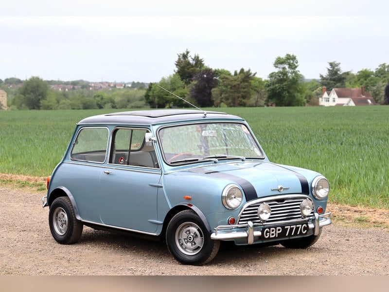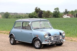 Doubtless swayed by the glamour associated with coachbuilt Minis – especially those crafted by Radford whose customers included Peter Sellers, Britt Ekland, John Lennon, Paul McCartney, Ringo Starr, George Harrison and Mike Naismith – the first owner had the Morris immediately repainted Opalescent Silver Blue and set about festooning it with Radford accessories. The exterior was visually enhanced with a Radford grille, Webasto sunroof, spot lights, wheelarch extensions, bumper overriders and Cosmic MK1 alloy wheels. Impressively, the Cooper is listed as Blue on the accompanying original green logbook which was issued just two days after the formerly Tweed Grey car left the factory!