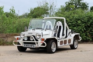 Reputedly one of six Portuguese-built Mini Mokes to have been customised by Austin Rover dealer Blandy Bros of Las Palmas de Gran Canaria, chassis TW7XKFPthe details below is further understood to have been supplied new to the Casa Dromedario on Lanzarote. Still wearing the latter’s logo on its bonnet, modifications are believed to have included: a prominent rollover bar, bespoke upholstery, faux wood trims (as per ‘The Prisoner’ Moke), and 12-inch alloy wheels. Relocating to the Casa Dromedario proprietor’s native Germany in 1997 where it apparently saw service at one of his Schlosses, the four-seater still bears signage declaring ‘vor kälte schützen’ (protect from cold) and ‘schwimmweste unter ihrem sitz’ (life vest under your seat). Fitted with a reconditioned 998cc A-Series engine eighteen years later, ‘E959 HFG’ currently shows a credible but unwarranted c. 12, 500km (c. 7, 800 miles). Showing signs of what is presumed to be the original factory wax coating to its engine bay and inner wheelarches etc, the Mini derivative retains a distinctly 1980s vibe. Offered for sale with a V5C Registration Document, history file and full complement of weather equipment.