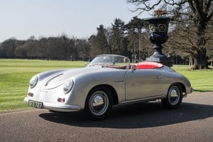 Utilising a Volkswagen Beetle donor, the identity of which still appears on its V5C Registration Document, this striking Porsche 356 Speedster Evocation is thought to have been completed during 2007. Finished in the handsome combination of Silver Metallic with Red leather upholstery, the 2+2-seater is powered by what looks to be a ‘crate’ motor (and thus lacks a distinct engine number). Re-registered as ‘EFZ 727’ since joining the William Hunt collection in 2016, the Speedster has been stabled alongside a wide variety of Porsche 911s. Nicely detailed with the earlier ‘beehive’ style rear lights and authentic instruments, it is currently running and driving but would doubtless benefit from recommissioning / going through prior to sustained usage. Offered for sale with sundry paperwork and soft-top.