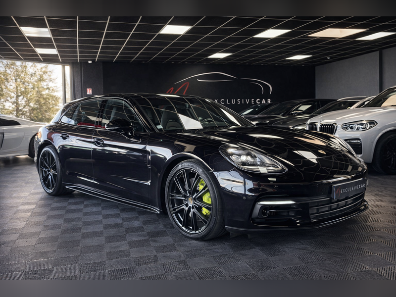 MY EXCLUSIVE CAR offers you this PORSCHE Panamera Sport Turismo in its plug-in hybrid 4 E-Hybrid version. Its configuration is fully equipped, notably with the panoramic sunroof, the Sport Chrono pack, electric Comfort seats with memory and heating, the heated steering wheel, rear-axle steering, adaptive cruise control, LED lights with PDLS, black exhaust tips, and 21-inch gloss-black finished wheels.