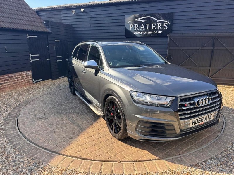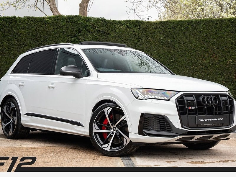 Fantastic Audi SQ7 Black edition, finished in glacier white metallic paint, black leather interior, featuring panoramic glass sliding roof, B&O surround sound system, 360 camera and parking sensors, heated seats, cruise control, 7 seats, Audi virtual cockpit, exterior black pack, privacy glass, bluetooth connectivity, satellite navigation and much more