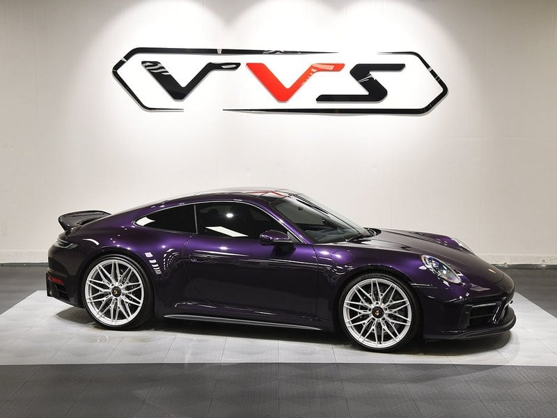 VVS are please to offer this 2023/ 73 Porsche 911 992 GTS finished in PTS Viola Metallic over black leather and alcantara GTS interior. This example is equipped with 18 way electric and heated seats, Heated steering wheel, GTS interior package, Carbon fibre interior package, Carbon fibre steering wheel, Carbon fibre illuminated door sills, Crayon stitching, Crayon seat belts, Burmester sound system, Drivers memory package, Voice command, Cruise control, Sports exhaust, Dual zone climate control, Sports chrono package, Sliding/ tilt glass sunroof, Clear rear taillights, PORSCHE logo in black, Front and rear parking sensors, 360 surround view cameras, Ducktail spoiler, Vorza performance exhaust, GT3 side skirts, Front end PPF, PCCB's with black callipers, 21/ 22" Vossen wheels and full Porsche service history from new with the balance of manufactures warranty until 09/ 26.