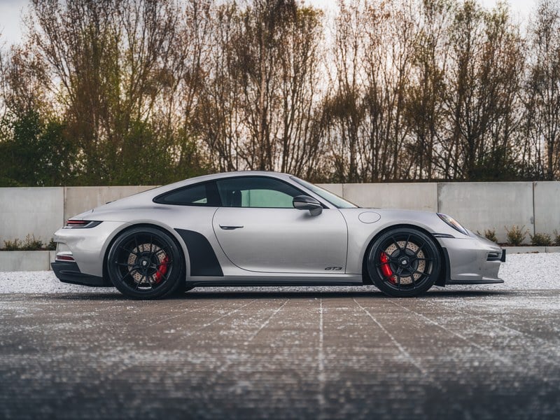 The 992. 1 GT3 Touring is mechanically identical to the winged GT3. Same 4. 0 litre naturally aspirated flat-six, same 510 hp at 8, 400 rpm, same double wishbone front suspension taken directly from the 911 RSR race car. The only difference is at the rear: no fixed wing, but an automatically deploying spoiler instead. This example has the six-speed manual gearbox and is finished in GT Silver Metallic. The car looks like a standard 911. What sits underneath it is not.
