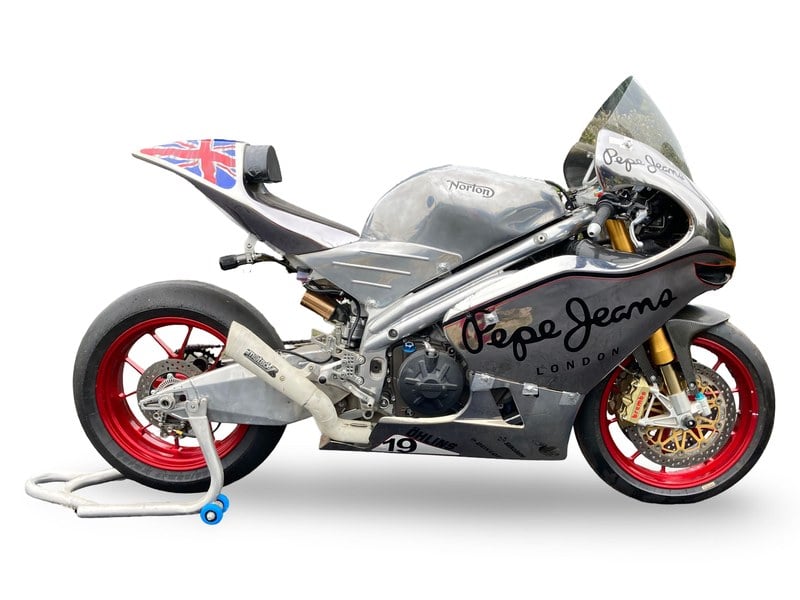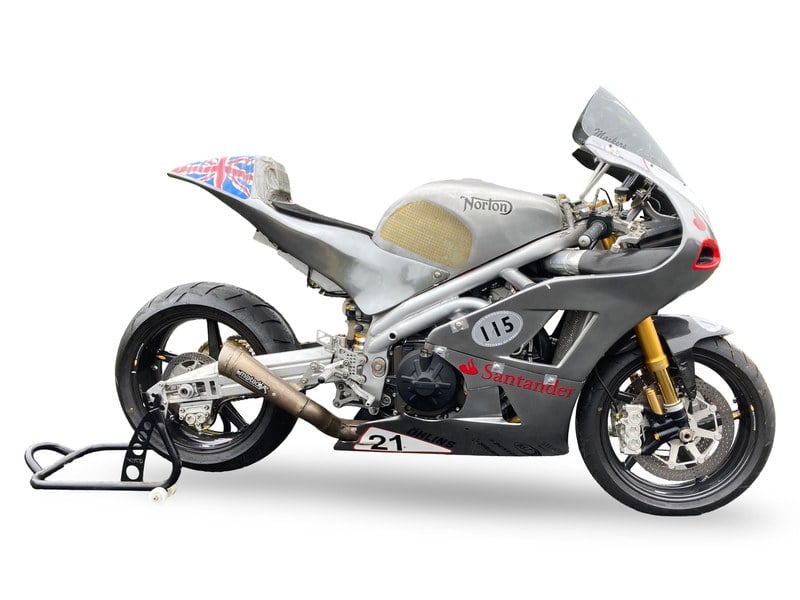 Den här motorcykeln är Lot 318 som auktioneras ut av Bonhams vid The Spring Stafford Sale (The International Classic MotorCycle Show) den 25:e och 26:e april. Se Bonhams Motorcycles-webbplats för fullständiga detaljer. Auktionstider: Lotter 1–94 säljs från 14:30 lördagen den 25 april 2026. Lotter 201–353 säljs från 11:30 söndagen den 26 april 2026. Öppettider för publik visning: Tillgänglig den 25 och 26 april 2026 från kl. 09:00 till 17:00, på Staffordshire County Showground (The International Classic MotorCycle Show). ** c. 2013 Norton 1 000cc V4 Factory Racing Motorcycle SG2 (nr 21)** Registreringsnummer ej registrerad Ramnummer: Ingen Motorblocknummer: * 05576* • Tidigare fabrikens racing-maskin • Antas vara Ian Mackmans TT-bike från 2013 • Kräver omställning och/ eller restaurering År 2012 utvecklade Norton-fabriken en racing-motorcykel baserad på Aprilia RSV4-motorn i ett Spondon-chassi, avsedd att tävla på Isle of Man TT. Snabbt hopmonterad uppnådde den lite tid på öns bana under träning 2012, men var inte berättigad att köra det året. Nästa år deltog två motorcyklar med Dan Hegarty och Ian Mackman vid rodret. Hegarty (på bikes nummer 38) lyckades sluta 36:a i Senior TT, men DNF i Superbike TT; Mackman (på bike nummer 21) blev 24:a i Senior och 18:e i Superbike. Vid tävlingarna 2014 och 2015 var Cameron Donald den enda föraren med två DNF-år, medan han 2015 hade DNF i Senior, men slutade 18:e i Superbike. Framåtblickande till 2019 tillkännagav Norton försäljning av en Limited Edition på 200 vägbikesmodeller kallad V4SS, baserad på erfarenheten från tävlingslaget, som erbjöds offentligt att beställas i förväg. Den privata säljaren av denna maskin beslutade, efter förslag från en vän, att investera i en V4SS och betalade fullt för en av de nya maskinerna. Det blev tydligt att beställningarna på V4SS-bilarna inte särskilt troliga att uppfyllas, då vår säljare pratade med sin vän som även var vän till Stuart Garner, Norton-VD. Det överenskommades att vår säljare skulle ta emot denna maskin, plus en annan racing-motocykel (också erbjuden separat i denna försäljning) i utbyte mot den inbetalda summan. Stuart Garner levererade båda maskinerna till vår säljares hem personligen. De har varit orörda sedan dess. Maskinen som erbjuds här, bär Ian Mackmans nummer 21 från TT 2013 och anses vara SG2-maskinen som han körde det året. Sedan förvärvet har denna maskin varit orörd och befinner sig i ’as found’-skick, med vissa komponenter saknade, även om vi kan bekräfta att motorn roterar. Den är utrustad med kolfiberhjul, ISR-fram- och bakbromsok, Ohlins-framgafflar och Ohlins bakdämpare. Den bär Mackmans racingnummer från 2013, hans smeknamn ’Mackers’-dekal på vindskyddet, samt Cosworth-dekaler, ihop med ett sticker från Goodwood Festival of Speed 2013 med nummer 115, där den kördes av Leon Camier och senare även paraderades vid Classic TT. Vid ett av dessa tillfällen paraderades den också av Mick Grant. Senare maskiner kördes vid TT från 2014 till 2019 av andra förare som Cameron Donald, Dave Johnson, Josh Brookes och John McGuinness. Eftersom denna motorcykel inte var i bruk när den införskaffades av säljaren och det är tydligt vid inspektion att den inte är i gångställd och inte är ’race-ready’ på något sätt, måste vi betona att maskinen behöver genomgå en grundlig omställning av någon som är bekant med varumärket och/ eller tävlingsmaskiner innan den kan köras eller återvända till banan. Potentiella köpare bör själva bedöma motorcykelns skick, historia och äkthet innan budgivningen. Sålunda, den som bevittnade dessa ikoniska maskiner rusa fram på Isle of Man TT-kursen, med den nerscaladiga ljudet från avgassystemet, kunde inte annat än bli ytterst entusiastisk över möjligheten att äga en att köra, paradera eller tävla med för sig själv. Vi har konsulterat källor med kunskap om dessa maskiner som råder oss att den ursprungliga TT-bodynkuppen från bike no. 21 avlägsnades direkt efter TT och bevarades för displayändamål. Det visar sig också att, som ofta är fallet med racing-motorcyklar, strax efter TT skulle flera delar ha tagits bort från maskinen för användning i andra maskiner. Detta inkluderar motorn, som nu antas vara en standard RSV4-motor. Svängarmen verkar tidsriktig och behåller rätt fas, länk och bakre dämpare. BST-kolfiberhjulen verkar korrekta för perioden. Gafflar, topplockar och bromsok verkar uppfylla rätt specifikation. Bränsletanken verkar vara korrekt i specifikation. Bakstegen och avgasen verkar av rätt typ. ECU och instrumentbräda verkar korrekta, och kabelhärksen ser i stort sett överensstämmande med perioden. Vissa komponenter av denna bike kan ha kommit från bike no. 38. Dokumentationen består av en kronologi av händelser av ägaren, samt kopior...