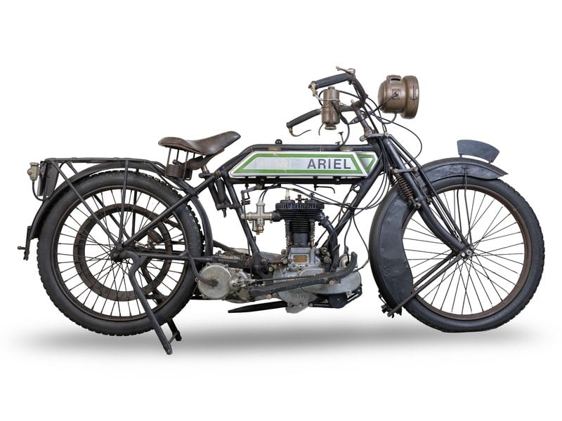 Esta motocicleta é o Lote 240 a ser leiloado pela Bonhams na The Spring Stafford Sale (The International Classic MotorCycle Show) em 25 e 26 de abril, consulte o site de Motocicletas da Bonhams para detalhes completos. Horário dos Leilões: Lotes 1 - 94 serão vendidos a partir das 14:30 de sábado, 25 de abril de 2026. Lotes 201 - 353 serão vendidos a partir das 11:30 de domingo, 26 de abril de 2026. Visitação pública: Disponível nos dias 25 e 26 de abril de 2026, das 09:00 às 17:00, no Staffordshire County Showground (The International Classic MotorCycle Show). A Coleção David Plant ** c. 1919 Ariel 3½hp** Número de registo não registado. Chassi nº 5302. Nº do motor 9014 (ver texto). Alimentada pelo motor White & Poppe e equipada com uma caixa de mudanças de veio-contramar de três velocidades, esta Ariel antiga é uma mistura de componentes restaurados e não restaurados, não obstante os itens que parecem restaurados serem apenas o depósito, as alavancas e comandos (possivelmente substituídos). Do contrário, a máquina tem acabamento original até aos guarda-lamas, ao quadro e ao selim (que é um Empire-De-Luxe com estofamento original). Esta Ariel tem suportes de mola do selim mais fortes, que evidentemente eram para máquinas militares. O primeiro dígito do número de motor é apenas uma aproximação e não pode ser determinado com certeza; no entanto, o cilindro tem números correspondentes e parece estar carimbado '9014'. O motor não dá volta, pois a caixa de velocidades parece estar emperrada. O ficheiro de história contém vários itens de literatura fotocopiada relacionada com motocicletas Ariel, incluindo detalhes da caixa de velocidades de veio-contramar de três velocidades da Ariel introduzida em 1914, juntamente com fotocópias da revista The Motor Cycle datada de julho de 1917, que ilustram um lote de máquinas Ariel de 3½hp destinados às forças aliadas durante a Primeira Guerra Mundial. Também no ficheiro existem cartas datadas de 1996 da Aerial Owners Motorcycle Club, dirigidas a Adrie de Graaff da Holanda, escritas pelo registar e arquivista da máquina do Clube, Sr. Hawkins. Nessas cartas, o Sr. Hawkins discute a especificação das máquinas Ariel produzidas durante a guerra entre 1914 e 1917, e observa que os registos de fábrica da era anterior à Vale Page (ou seja, aqueles produzidos antes da reorganização da empresa em 1926) foram armazenados separadamente da documentação posterior e, infelizmente, foram destruídos durante um bombardeio aéreo de guerra, o que significa que os registos de produção em fábrica detalhados para máquinas desse período já não existem. O Sr. Hawkins também observa que os números de chassis e motor Aerial desse período não parecem seguir qualquer sequência claramente identificável, tornando a datação precisa difícil. Comentários adicionais indicam que o guiador extraordinariamente largo instalado na máquina seria compatível com a especificação de guerra. O ficheiro de história inclui ainda fotografias da Ariel conforme encontrada e antes da restauração, mostrando uma placa de data de 1915 presa à frente da motocicleta. No conjunto, o ficheiro representa uma vasta coleção de material de pesquisa fotocopiado relacionado com a produção inicial da Aerial e máquinas de guerra, embora não exista documentação sobrevivente que data com certeza esta motocicleta. Recomendam-se assim novas pesquisas para estabelecer se a máquina foi originalmente fornecida como motocicleta militar de guerra e mais tarde civilizada após a Primeira Guerra Mundial, ou se representa uma máquina de produção pós-guerra com especificação semelhante. Outras correspondências em arquivo incluem uma quantidade de cartas trocadas entre o vendedor e Adrie de Graaff da Holanda. Numa carta de junho de 1998, Adrie observa que a Aerial do Exército é considerada datar de novembro de 1915, parte de um lote fornecido ao Fronte Italiano durante a Primeira Guerra Mundial. afirma que a máquina parece ter permanecido na Itália durante grande parte da sua vida, estando praticamente completa e original, comentando que “pertence ao conjunto, até mesmo o correio em V” (V-belt). Adrie descreve a máquina como com acabamento em verde militar com letras brancas, observando que novos pratos de pé foram instalados, já que os originais estavam partidos, embora as peças originais tenham sido mantidas. Regista ainda que o selim é o tipo militar original mais resistente, enquanto o cassete primário estava ausente, embora acreditasse que poderia obter-se um substituto junto de um fornecedor na Inglaterra. A carta também menciona que não há documentação original que acompanhasse a máquina. O motor Minerva relatou-se exigir apenas limpeza, com anéis de pistão ainda utilizáveis, embora o interruptor de contacto estivesse ausente e algumas aletas de arrefecimento estivessem partidas. Na altura, o carburador também estava ausente, sendo o tipo correto um Longuemare, que Adrie observa ter ficado recentemente disponível numa forma nova. Não existem documentos com este Lote. Após um período de inatividade, esta motocicleta exigirá recommissioning e/ ou restauro em maior ou menor grau antes de regressar à circulação e, por isso, é vendida estritamente como vista. Os potenciais compradores devem certificar-se da completude, história, autenticidade, originalidade e estado mecânico desta motocicleta.