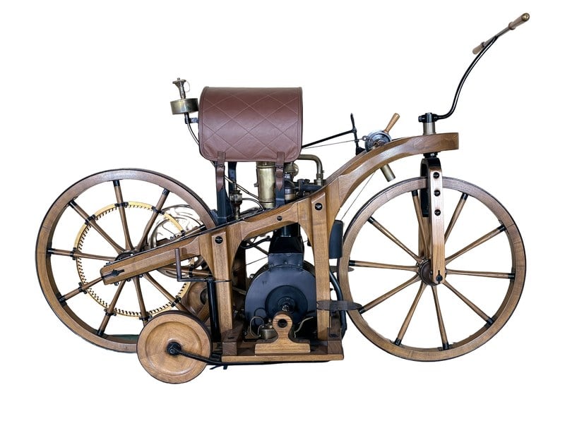 In 1885, German inventor Gottlieb Daimler, whose name would later become inextricably linked with that of Benz, demonstrated his prototype high-speed internal combustion engine, which was installed in a rudimentary two-wheeler: the modern motorcycle had been born. Daimler and his collaborator Wilhelm Maybach had both worked for the Deutz engine company, helping to develop a successful four-stroke stationary engine powered by mains-supplied coal gas. Daimler though, could see the potential of such an engine as a means of propulsion, providing it could be developed to run on an alternative fuel. Fortunately, there was one readily available: benzine (petrol), which hitherto had been used mainly as a cleaning fluid for clothing.