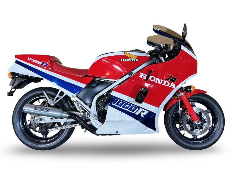 Hondas Mittelformat- bis Schwergewichtsklassen wurden in den 1970er Jahren durch eine Folge von Querrahmen-, Reihen-Vierzylindern erreicht, doch gegen Ende des Jahrzehnts begann der japanische Hersteller stärker zu V-Motoren zu wechseln, der erste Vierzylinder, der VF750, kam 1982. Kleinere VF400- und VF500-Vierzylinder folgten, zusammen mit dem ranghöchsten VF1000F- und VF1000R-Modellen, letztere - eine limitierte Auflage als 'Race Replica' - gekennzeichnet durch ihre getriebegriebene (im Gegensatz zu kettengetriebenen) Obergreifkurbelwellen. Die VF1000R sollte die Rennerfolge des CB1100R fortführen und war ebenso gut verarbeitet und ausgestattet wie ihr eindrucksvoller Vorgänger, mit einem Schnellwechsel-Vorderrad und Hondas Pro-Link-Hinterradaufhängung sowie weiteren Innovationen. Letztendlich war die große VF dem Rennstreckeneinsatz zu schwer, aber sie wurde dennoch ein fantastischer Sport-Tourer für die Straße. Exklusiv, kostspielig (etwa 70% teurer als eine Kawasaki GPz1100 im Jahr 1985!) und schnell (über 150 mph); die VF1000R verkaufte sich entsprechend in geringen Stückzahlen und wird heute von Sammlern hoch begehrt.
