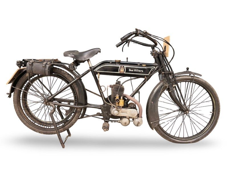 Denna motorcykel är Lot 275 som auktioneras ut av Bonhams vid The Spring Stafford Sale (The International Classic MotorCycle Show) den 25:e och 26:e april. Se Bonhams Motorcycles webbplats för fullständiga detaljer. Auktionstider: Lotter 1–94 säljs från kl. 14:30 lördagen den 25 april 2026. Lotter 201–353 säljs från kl. 11:30 söndagen den 26 april 2026. Publik visning: Tillgänglig 25–26 april 2026 kl. 09:00–17:00, vid Staffordshire County Showground (The International Classic MotorCycle Show). Rex Judd Collection ** 1914 Sun-Villiers 269cc** Registreringsnr. CE 3267 Ramnr. A2238 Motor nr. 2429 (se text) • Långvarigt ägt av Judd-familjen i minst 76 år • Komplett med Pioneer Certificate • "... den mest pålitliga lilla hojen som alltid kom till Brighton..." Den Birmingham-baserade Sun-verksamheten ägdes av Parkes-familjen som drog nytta av den sena-nittonhundras boom inom cykelförsäljningen. De började tillverka ordinära (penny farthing) cyklar 1885 och upprättade även en gjutformad skruv- och ramframställningsanläggning. Detta var ett lönsamt drag, för snart levererade de ramar, rör och gjutna plattningar till rivaliserande cykelproducenter. År 1911, välrustade tack vare sina framgångsrika cykelaktiviteter, utökade Sun till motorcyklar och avtalade med Frank Baker att bygga Sun-motorcyklar utrustade med hans Precision-motorer. Två år senare gjorde de en liknande överenskommelse med Villiers som födde Sun-Villiers-maskinerna. Inledningsvis drevs de av den 349cc fyrtaktmotorn, följt kort därefter av Villiers nya 269cc tvåtaktsmotor – som ses i denna motorcykel. Förutom att förse andra tillverkare med komponenter, levererade Sun kompletta motorcyklar med proprietära motorer till andra företag som kunde märkas efter kundens önskemål. Dessa inkluderade Federal- och Federation-motorcyklar som marknadsfördes av Co-op. Bolaget fortsatte att vara verksamt till 1961 då det såldes till Raleigh Industries Group. Denna Sun-Villiers levereras med V5C, V5 och en gammal buff-loggbok som daterar från 27. 2. 1950 och visar första registreringsdatum som 12. 3. 1921 samt Rex Judd som den enda registrerade innehavaren. På grund av vad som verkar vara DVLA-uppteckningsfel visar V5 & V5C motornumret som 3429 istället för 2429, och första registreringsår som 1931 istället för 1921, trots att båda detaljerna är korrekt upptecknade i buffloggboken, men observera att samtliga ovan nämnda registreringshandlingar felaktigt anger märke som "Sun Villiois" och motorstorlek som 249cc istället för 269cc. Även levereras flera utgångna skattebrickor, de flesta från 1920-talet, en faktura från 2011 för magnetovård, och ett nuvarande Pioneer Certificate från 2011, där ramnumret felaktigt uppgetts som A11238. Det är trevligt att se att hojen behållit sitt registreringsnummer i Cambridgeshire. Vi är tacksamma mot Richard Rosenthal för hans hjälp och insikter i Sun-Villiers historia. Förebyggningstecknet "A" till ramnumret för denna maskin indikerar att den tillverkades 1914 för 269cc Villiers-motor. Sun-Villiers kördes i 1950 års Pioneer Run av den nittonårige Peter Judd. Han var åtföljd av sin far som den dagen körde en Wilkinson. Senare kördes den i Pioneer Runs 2011, 2012 och 2014. Paul Sands som körde den 2011 och 2012 sa: "det var den mest pålitliga lilla hojen som någonsin nådde Brighton utan problem". Motorn snurrar, men motorcykelns mekaniska skick är okänt, och efter en lång period i förvaring kommer återstart eller möjligen mer omfattande arbete att krävas innan nästa stora äventyr. Köparna måste själva bedöma motorcykelns ursprung, skick, ålder, fullständighet och originalitet innan budgivning. Såld som den är. Nyckel inte krävs. ** The Rex Judd Collection** Baby-boomer- och Gen X-motorräddare från nordvästra London-området kommer förknippa Rex Judds namn med den livliga Edgware-baserade motorcykelhandlaren. Tidigare generationer, tyvärr inte längre med oss, skulle ha kommit ihåg Rex Judd, världsberömd motorcykelförare mest känd för sina bedrifter på Brooklands på 1920-talet. Född på juldagen 1899, under WW1 tjänstgjorde den unge Rex i RFC som sedermera integrerades i RAF. Därefter, som motorcykelnörd, hängde han runt Brooklands-banan i hopp om ett jobberbjudande – vilket kom, vilket resulterade i att han körde en racing-sidvagn som passagerare. Detta ledde till att han gick med i en av tidens bästa trimare, "Wizard" O'Donovan, med vilken han arbetade på och tävlade med 500cc Norton och 250cc tvåtakts Velocette. Under denna period vann han många lopp och satte flera hastighetsrekord, bland annat Godfrey Cup för den första 500cc-maskinen som överskred 90 mph. Han körde 250cc tvåtakts Velocettes på Island 1921 och 1922 men drog sig tillbaka vid båda tillfällena. I slutet av 1922 gick Rex till Douglas, som då var i uppsving med sina ...