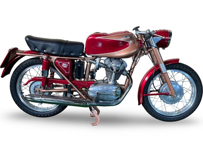 Designed by Fabio Taglioni, the first Ducati overhead-camshaft single - the 100 Gran Sport - appeared on the racetrack in 1954 and soon proved unbeatable in its class. Taglioni's versatile design proved capable of considerable enlargement, being produced in various capacities from the original 98cc up to 450cc. The 175cc class was popular in Continental Europe and Ducati's first offerings in that category appeared towards the end of the 1950s. A pair of 175cc roadsters was introduced for the 1956 season, the sports version of which (known as the 'Silverstone' in the UK) was capable of more than 80mph in road trim and close to the 'ton' when stripped for racing, an astonishing achievement at the time and one that helped establish the giant killing reputation long enjoyed by Ducati's miniature masterpieces. Manufactured for only a few seasons prior to the introduction of the 204cc 'Elite' range, these 175cc models are today relatively rare.