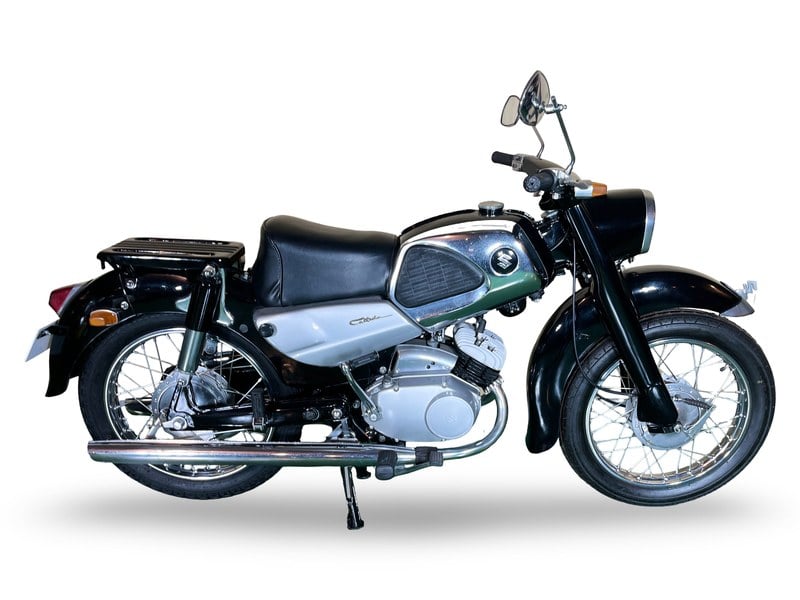 Michio Suzuki's company started life as a manufacturer of looms for the silk-weaving industry, diversifying into the production of clip-on engines for bicycles in the early 1950s. Suzuki did not make its first complete motorcycle until 1954, although these early models were marketed under the 'Colleda' name. At the end of 1954 Suzuki abandoned the clip-on market, instead offering a complete machine, albeit one with a bicycle-type frame and front fork: the Mini-Free. Unlike its predecessors, the Mini-Free carried its single-cylinder two-stoke engine ahead of the pedalling gear below the down-tube, while drive to the rear wheel was by 'V' belt. The Mini-Free was a popular model and was produced for four years, disappearing in 1958. That same year Suzuki entered the ultra-lightweight market sector, taking on the Honda Super Cub with the Suzumoped, a purpose-built small motorcycle, powered by the Mini-Free engine, which had clearly been inspired by the NSU Quickly.